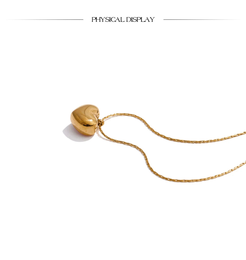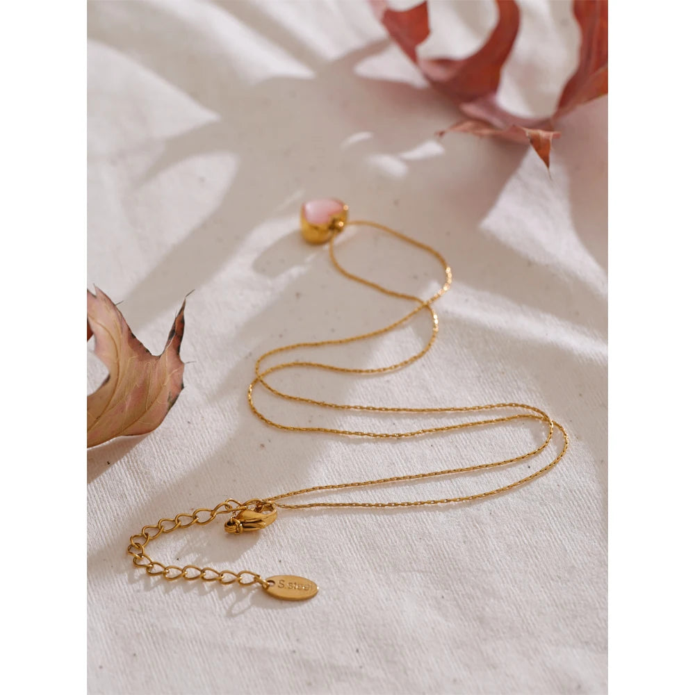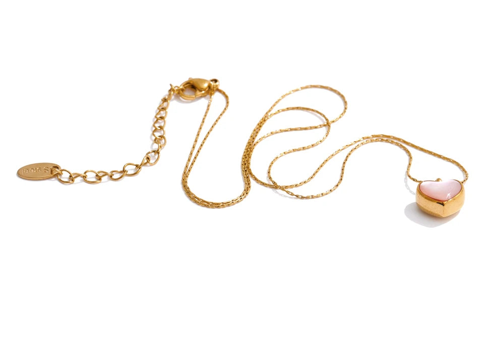 A soft blush heart charm on a refined gold-tone chain. Feminine, minimal, and effortless for everyday wear or layering.