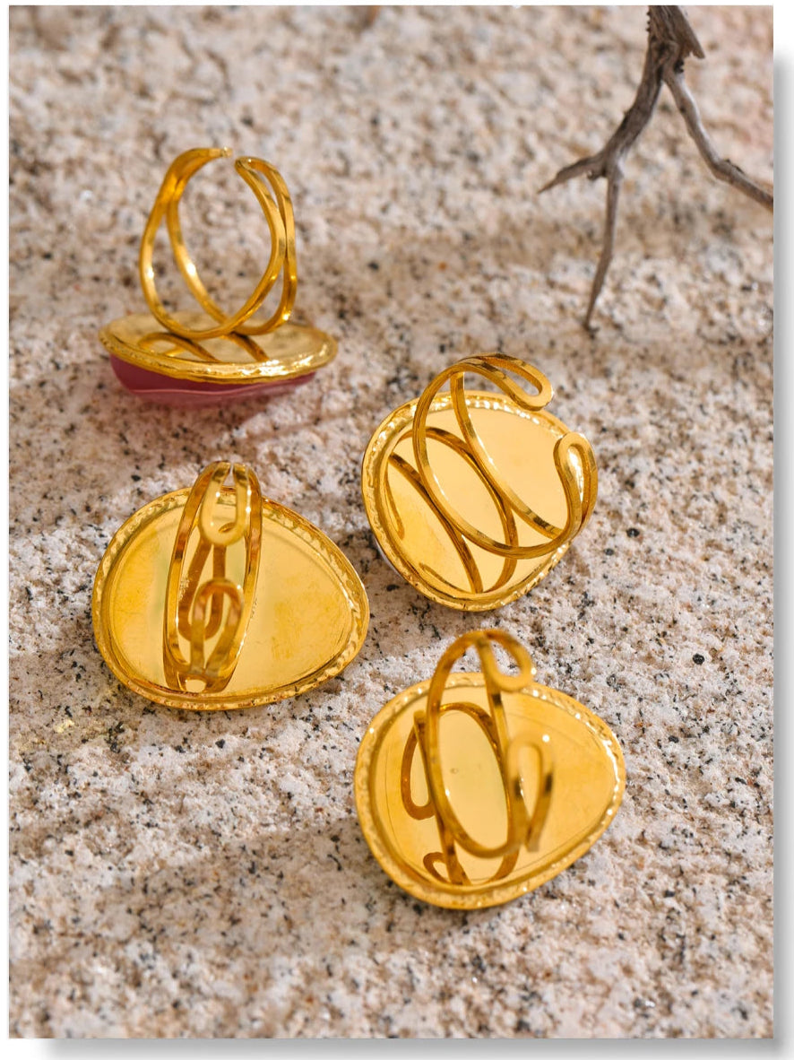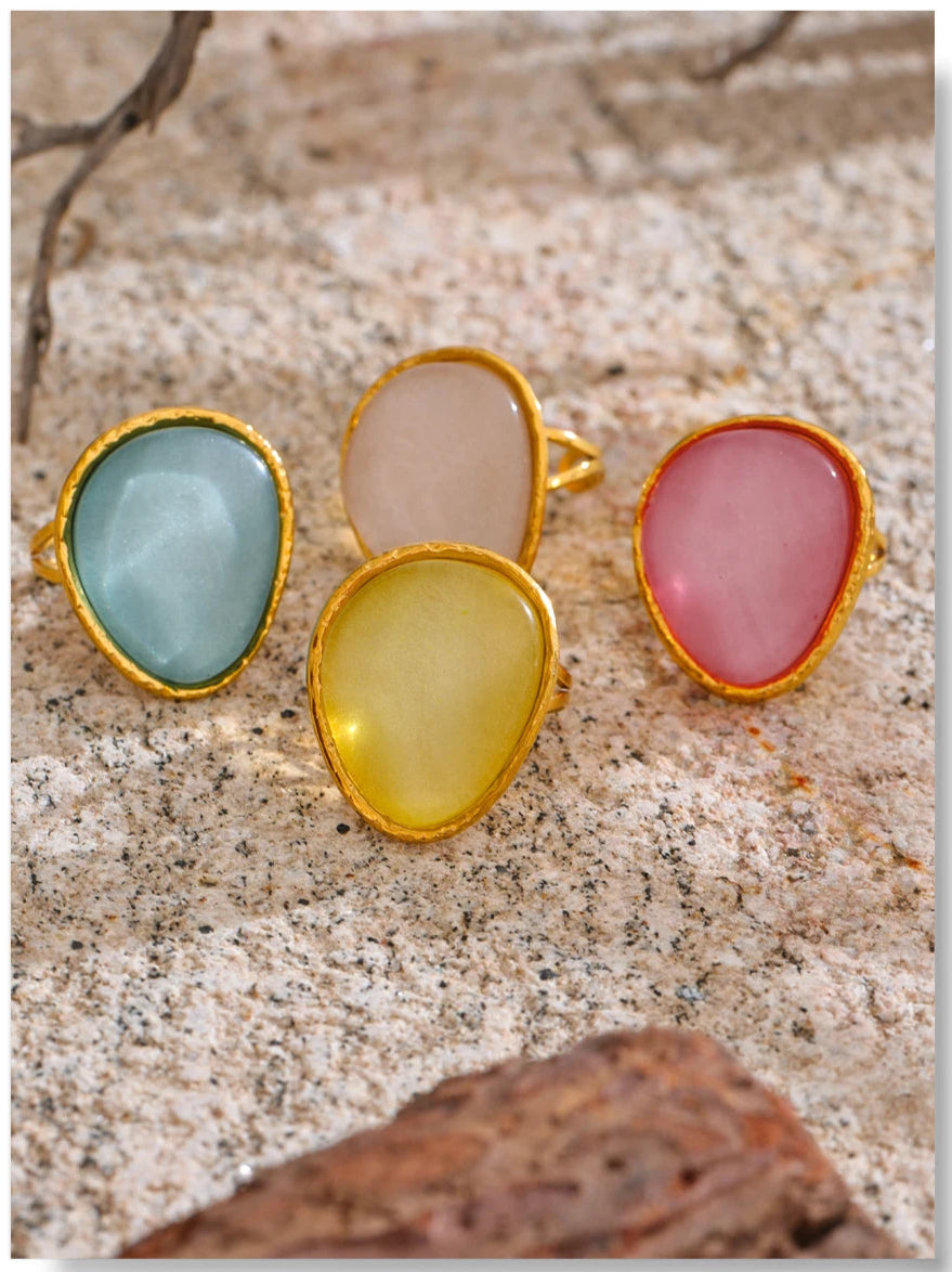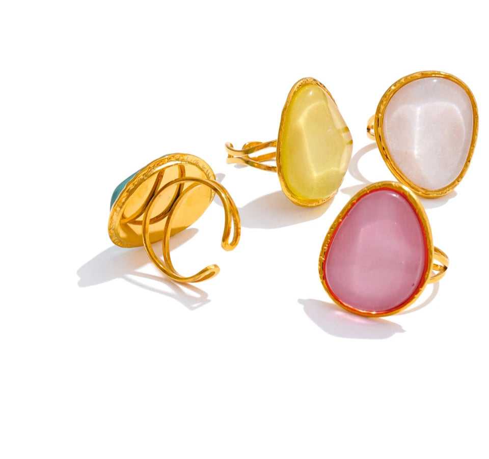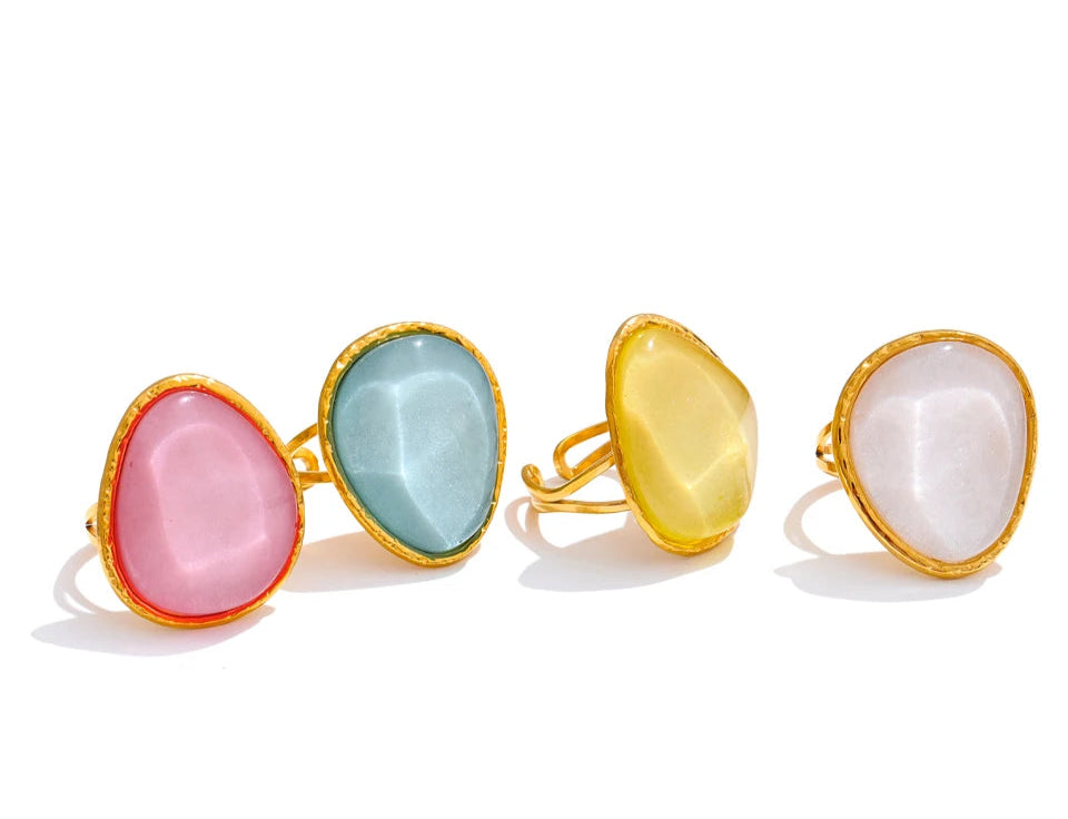 Infuse your style with vibrant energy through these stunning gold-plated statement rings, featuring pastel-toned stones in pink, aqua, lemon, and pearl white. Crafted with high-quality, anti-tarnish, and water-resistant materials, these rings promise long-lasting brilliance and daily wear comfort.