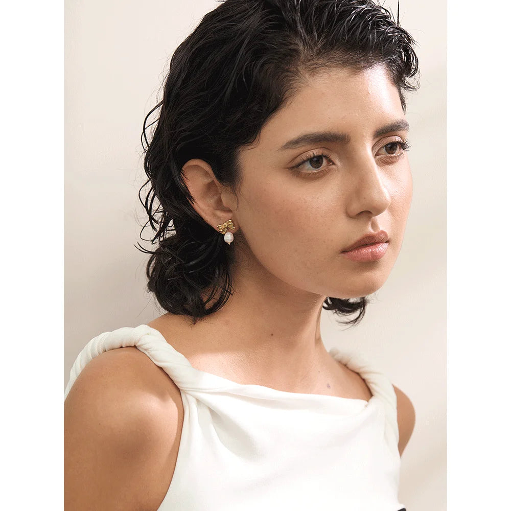 Graceful bow-knot studs cradling luminous pearls — a playful yet elegant design that brings a hint of romance and sophistication to any look.