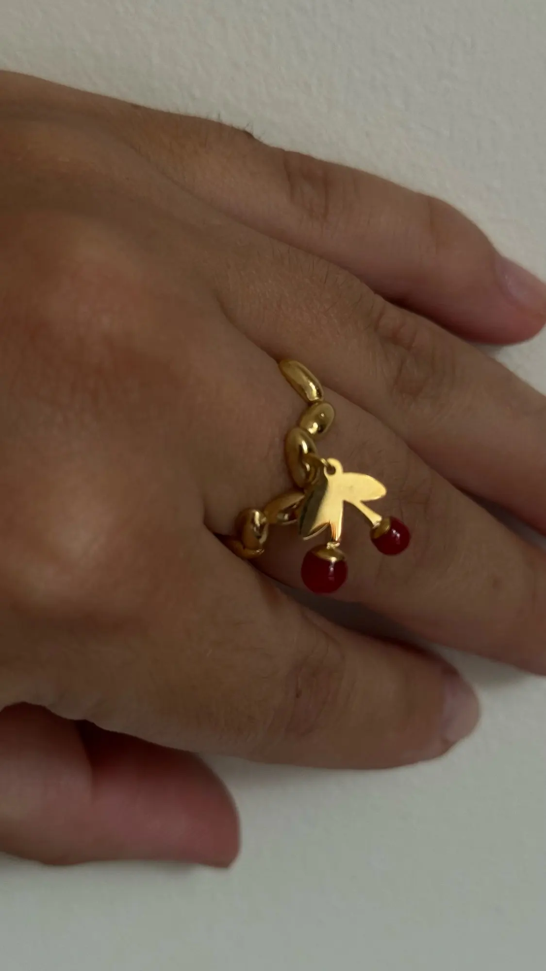 Sweet with a hint of boldness. This charm Ring combines glossy gold tones with vibrant cherry details for a playful, feminine touch. It’s perfect for adding color to neutral outfits or embracing a flirty summer vibe all year round.