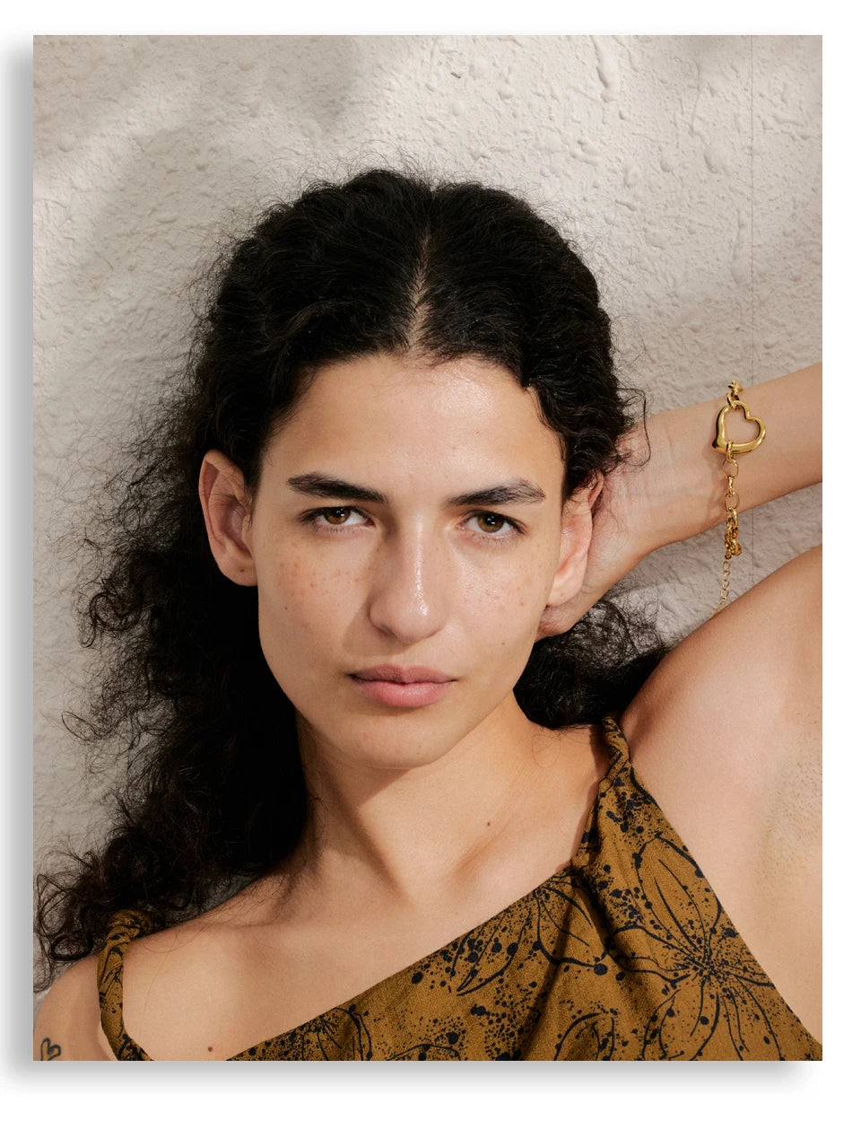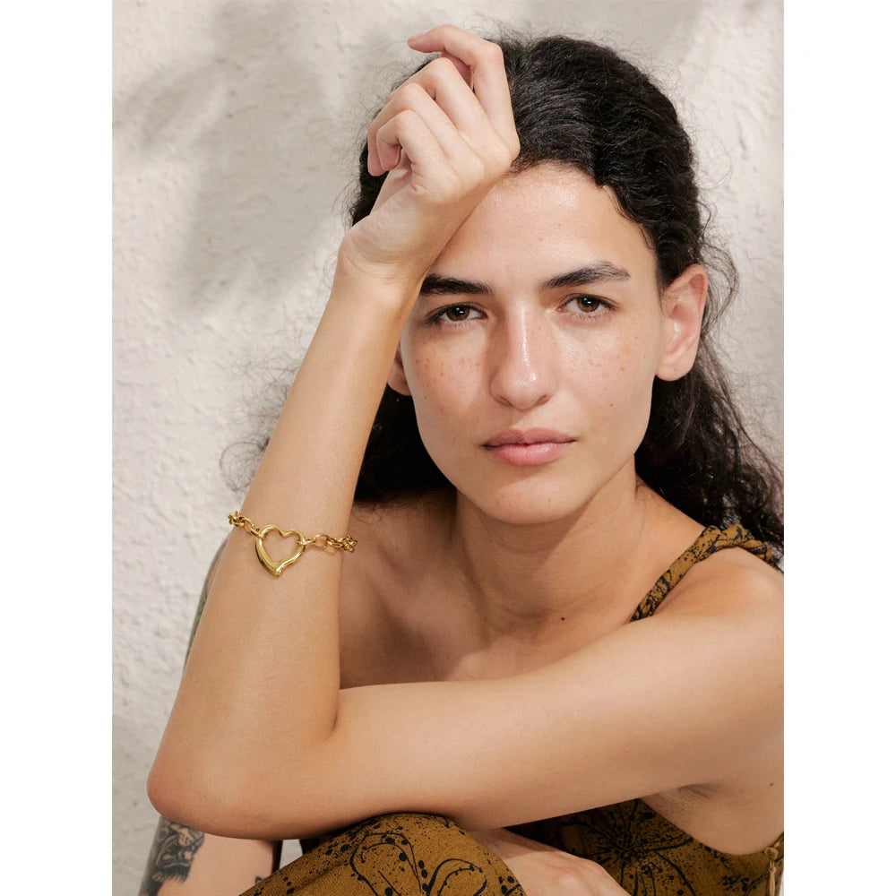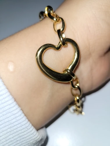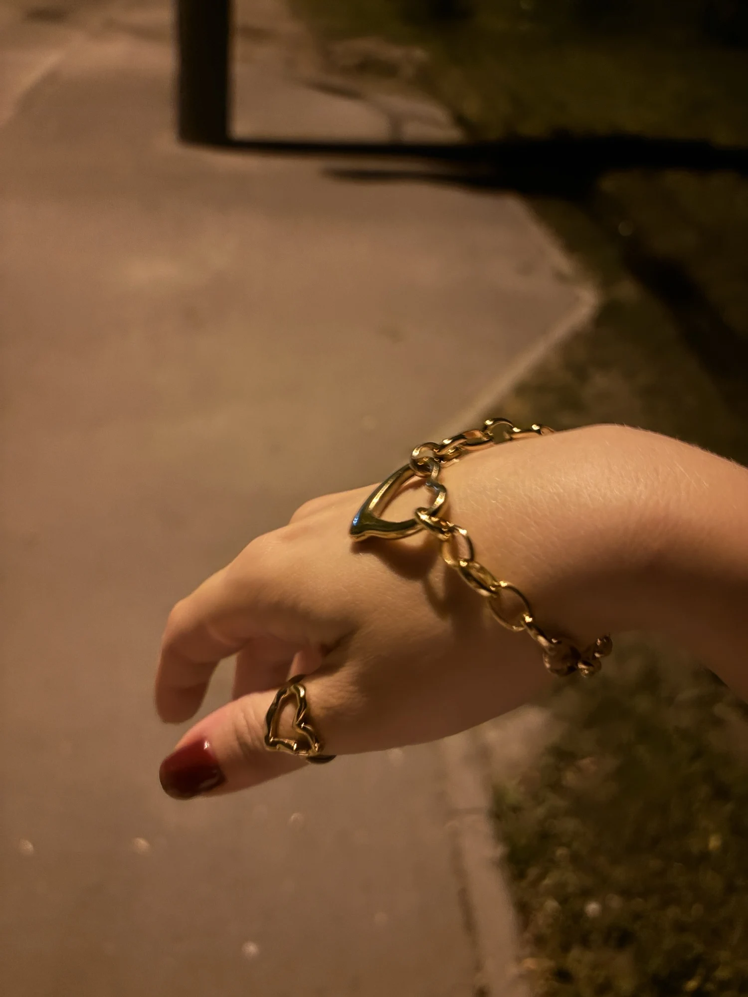 A statement bracelet with oversized golden links and a bold heart charm. Perfect for those who love jewelry with presence, this piece adds confidence and personality to any outfit.