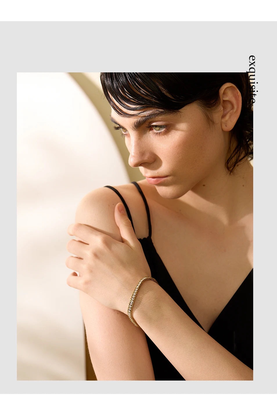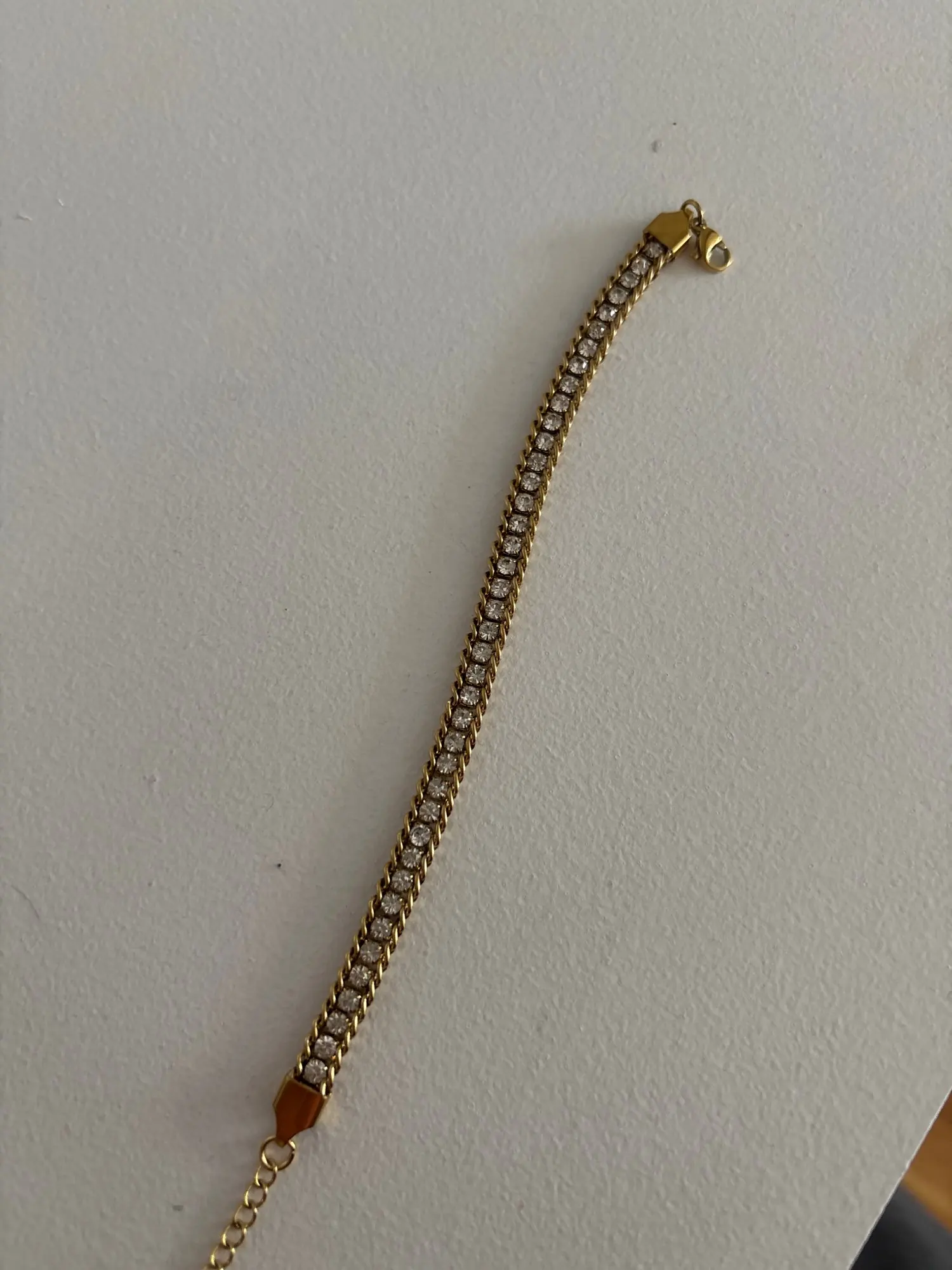 A golden chain enhanced with a full line of radiant crystals, offering a glamorous sparkle. Elegant and bold, it’s made to stand out.