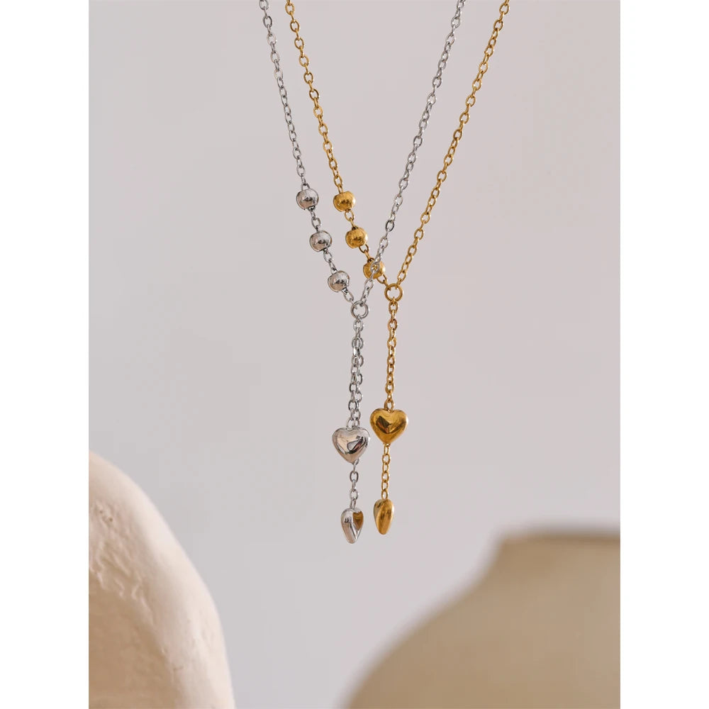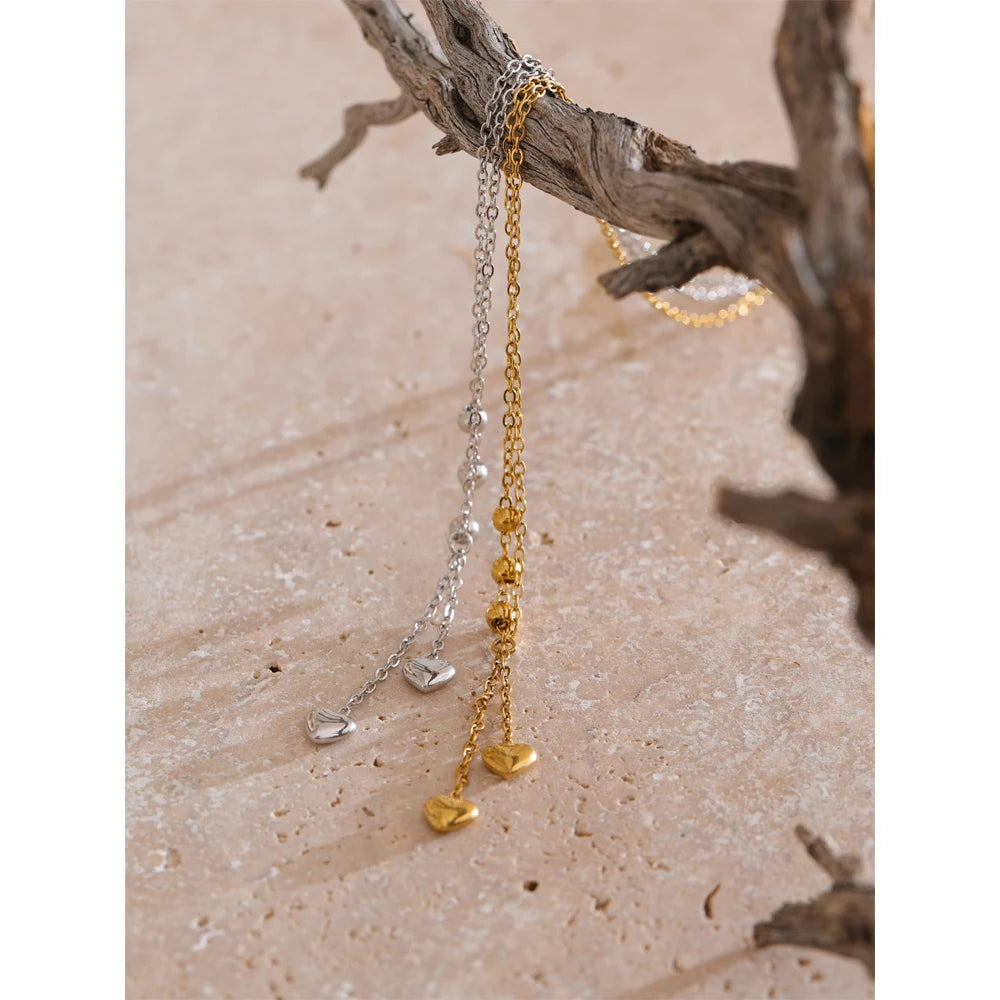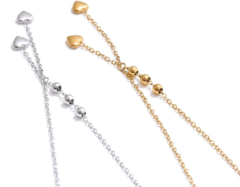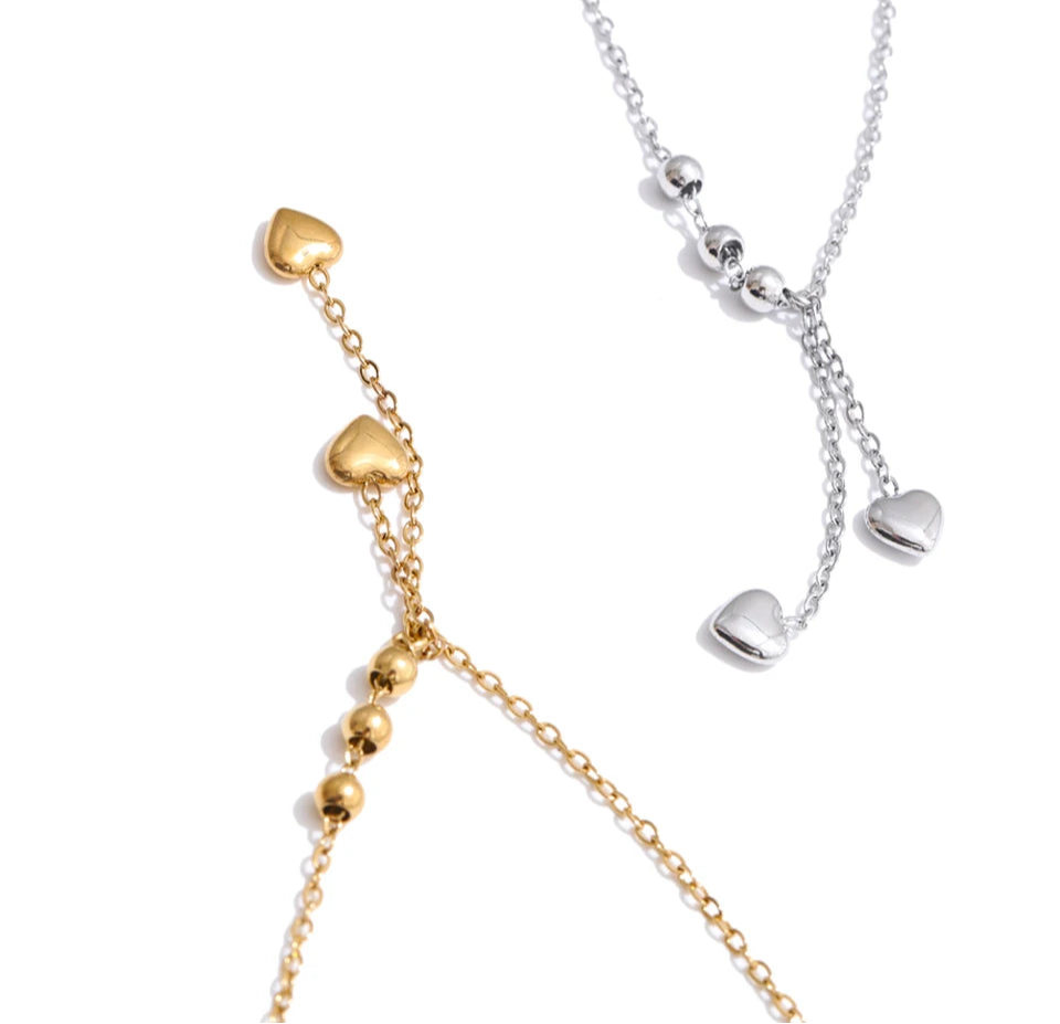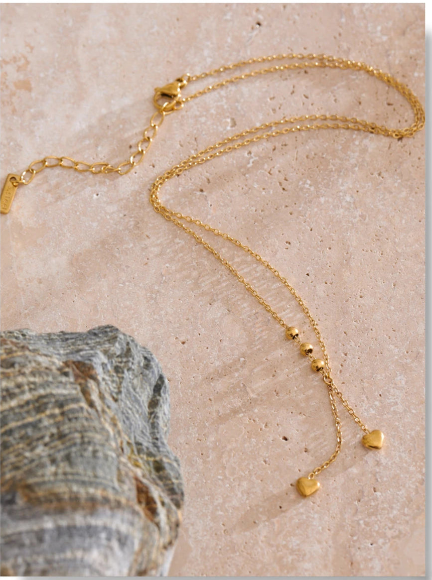 Y-necklace with polished bead stations and two tiny heart drops. A slim, elegant silhouette that layers beautifully.