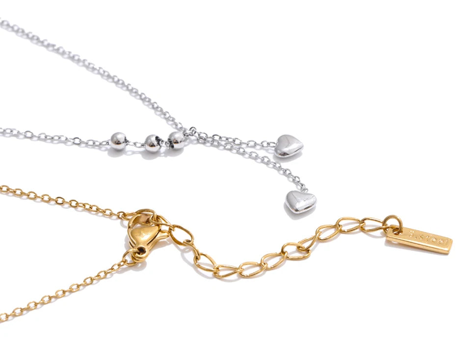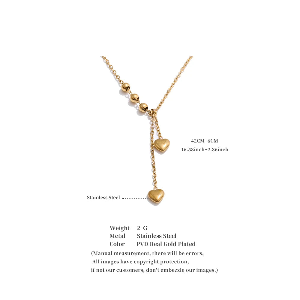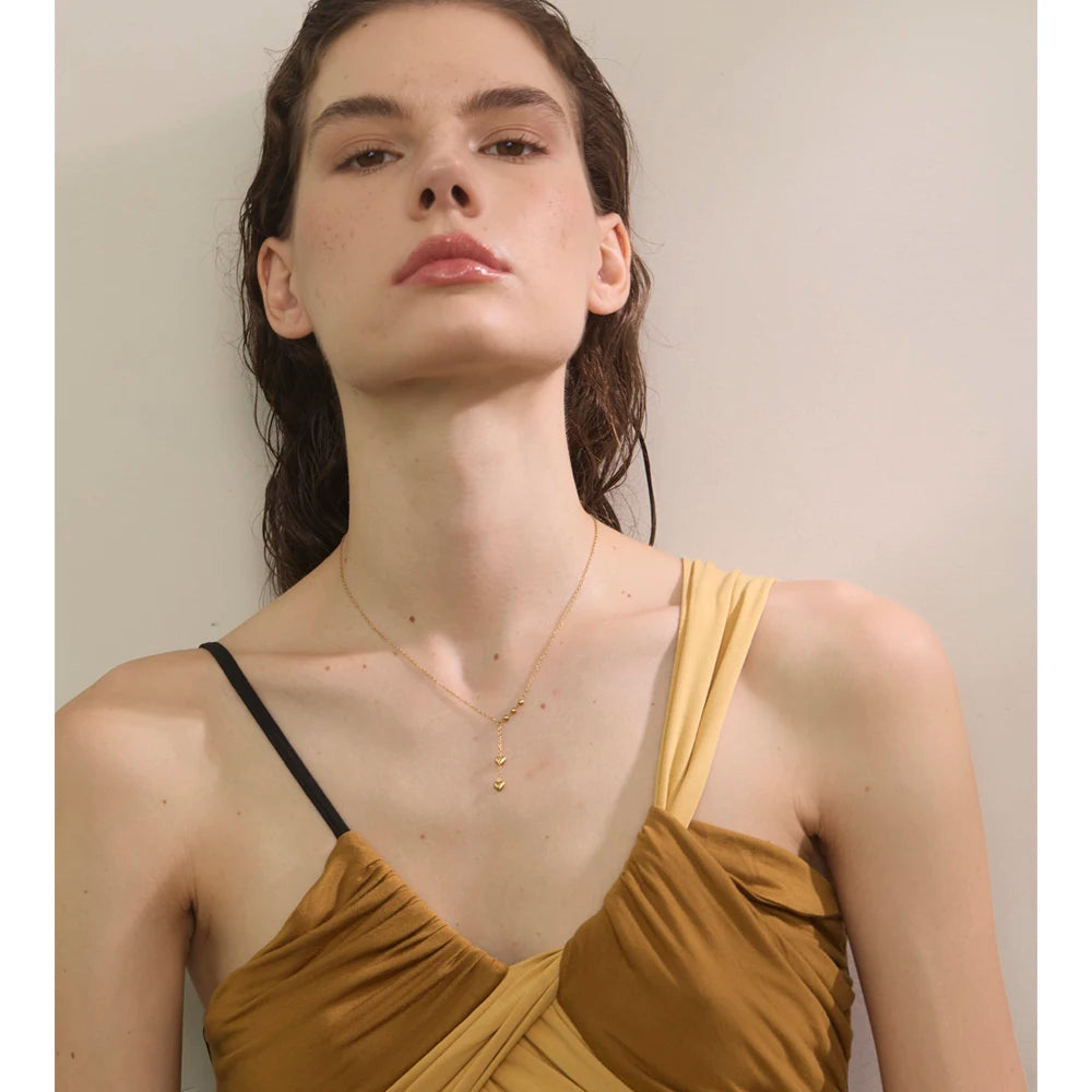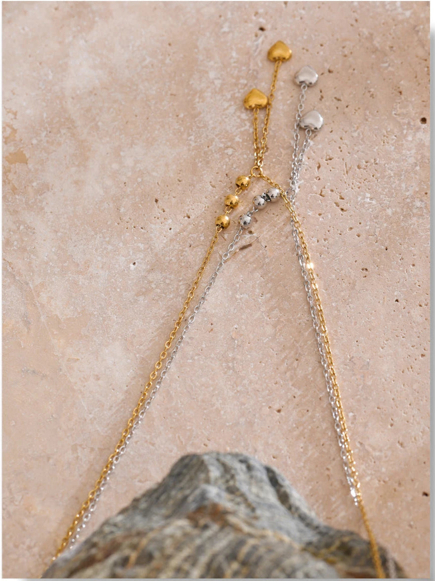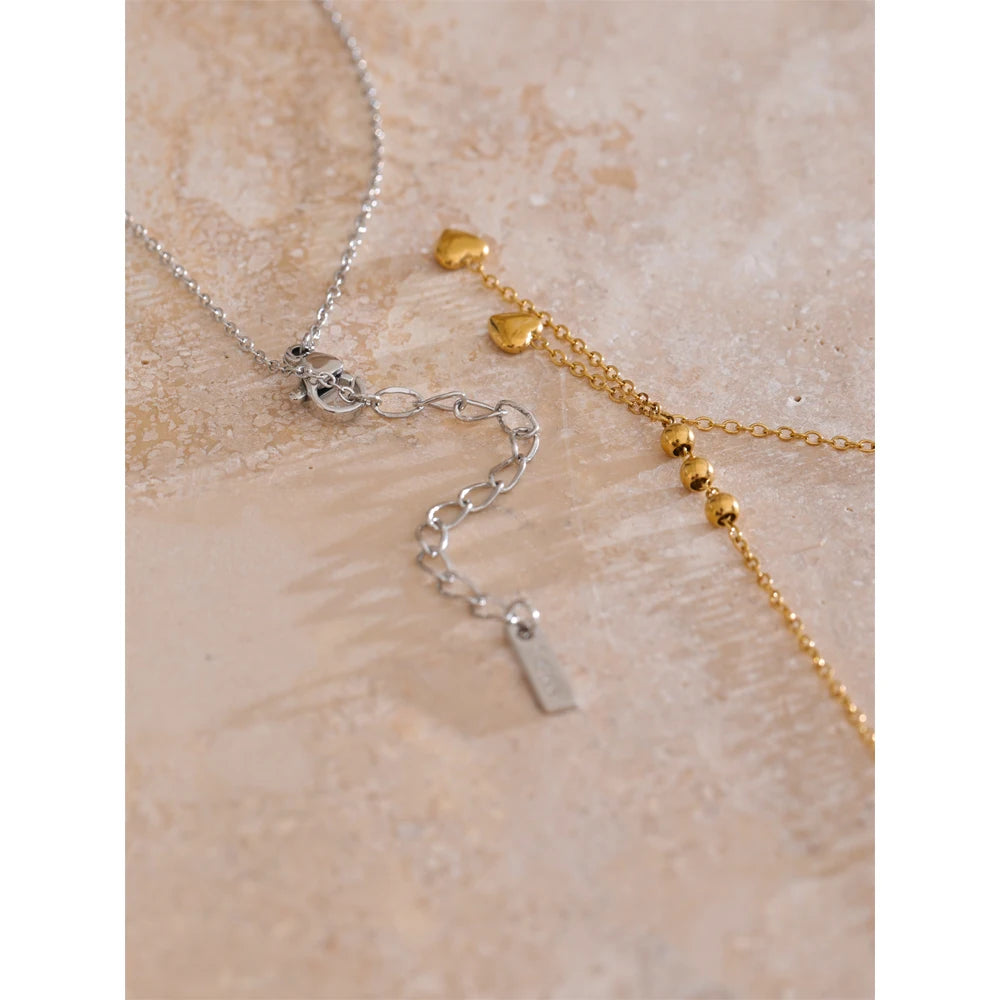 Y-necklace with polished bead stations and two tiny heart drops. A slim, elegant silhouette that layers beautifully.
