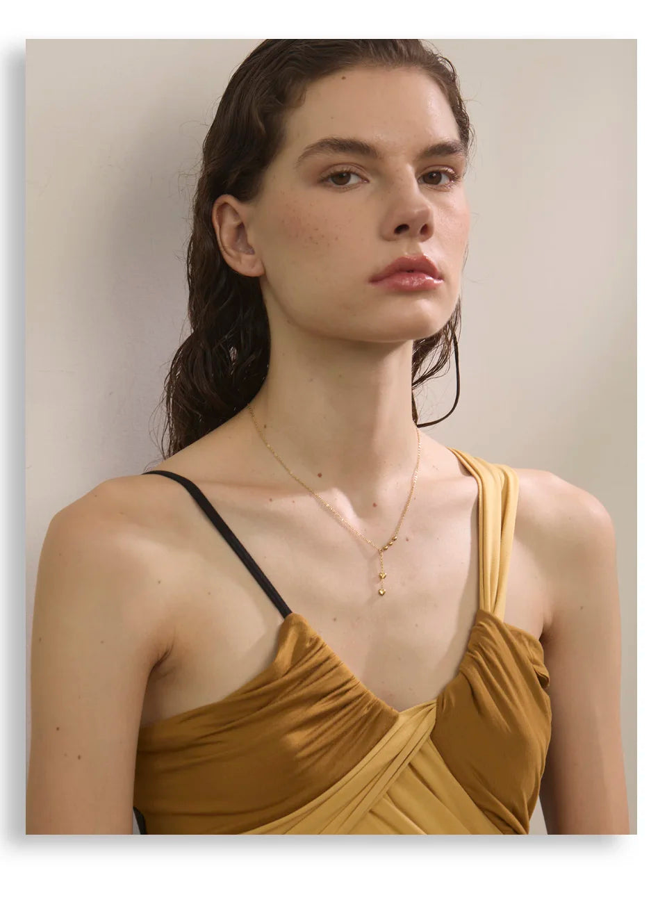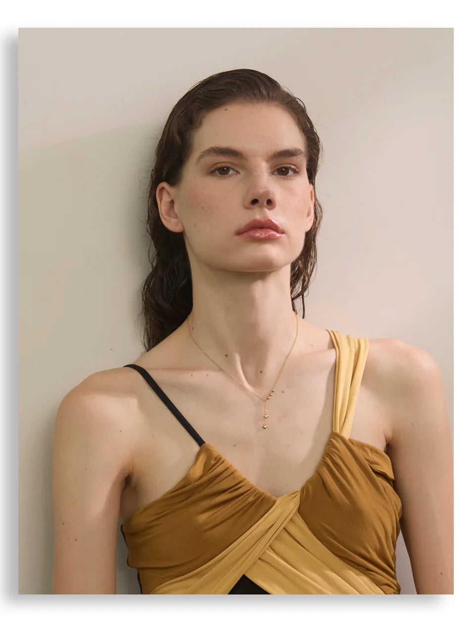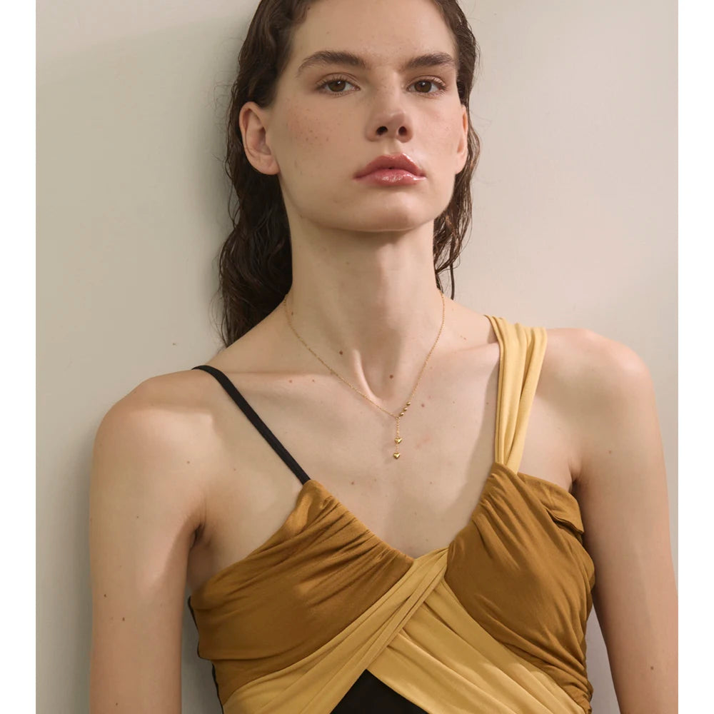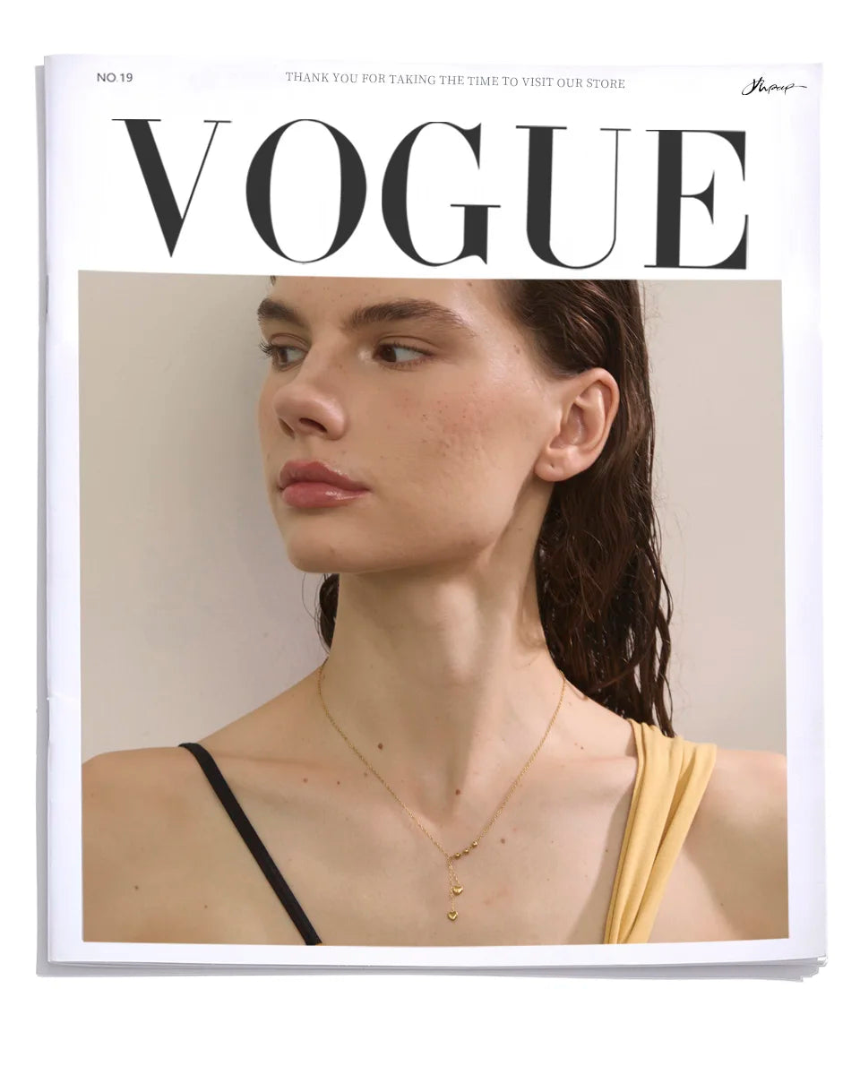 Y-necklace with polished bead stations and two tiny heart drops. A slim, elegant silhouette that layers beautifully.
