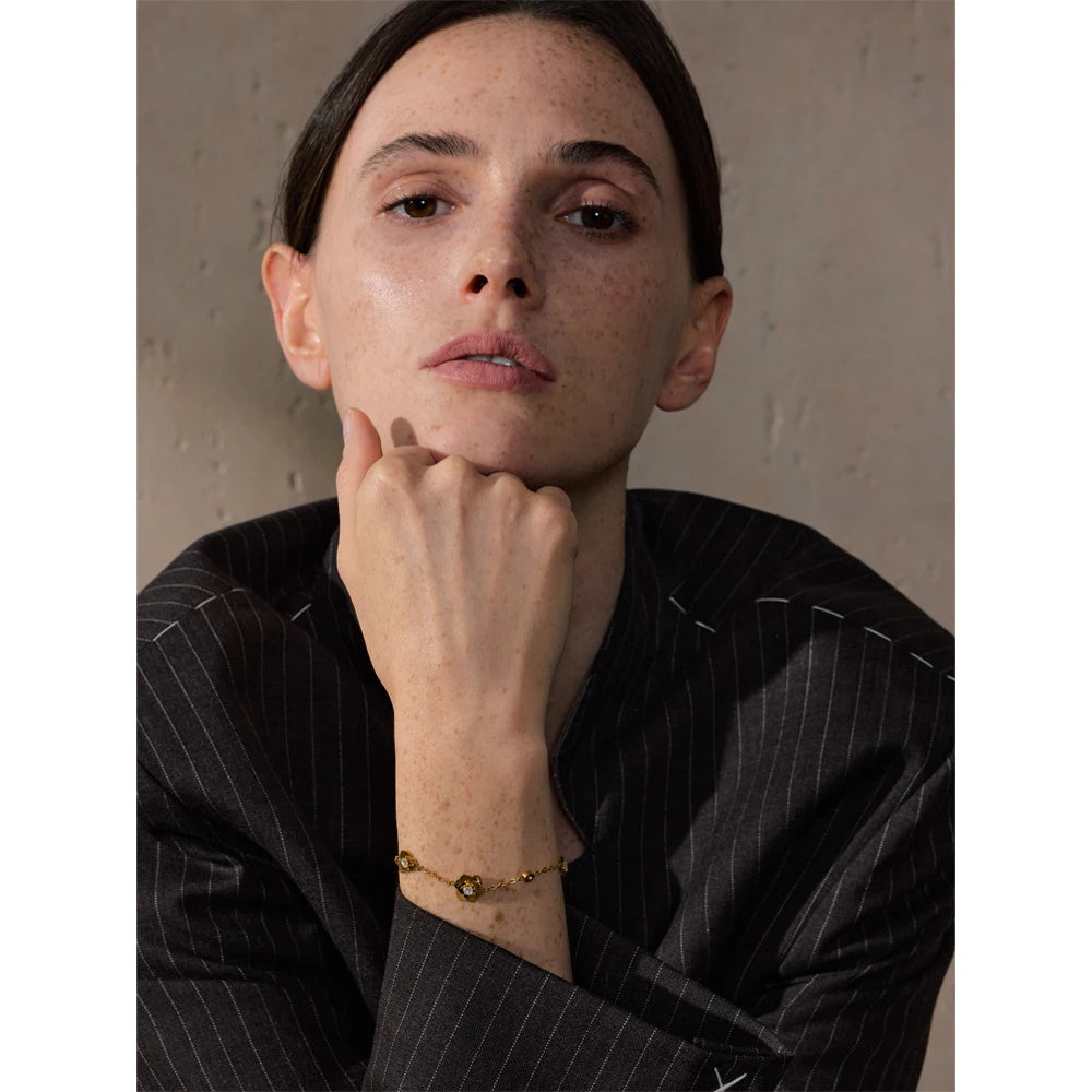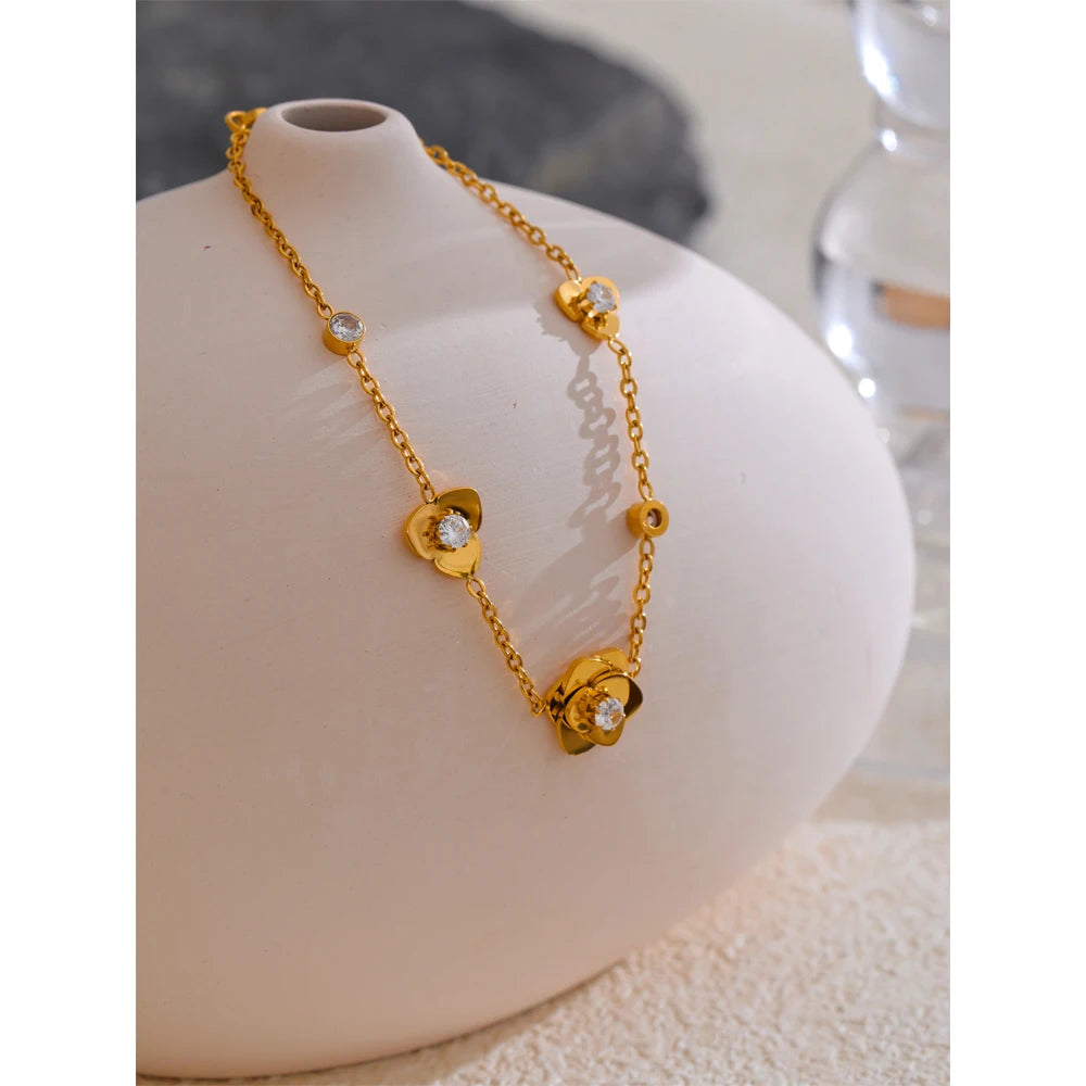 A feminine bracelet adorned with delicate golden flowers and crystal details. A romantic piece that adds a soft sparkle to any outfit.