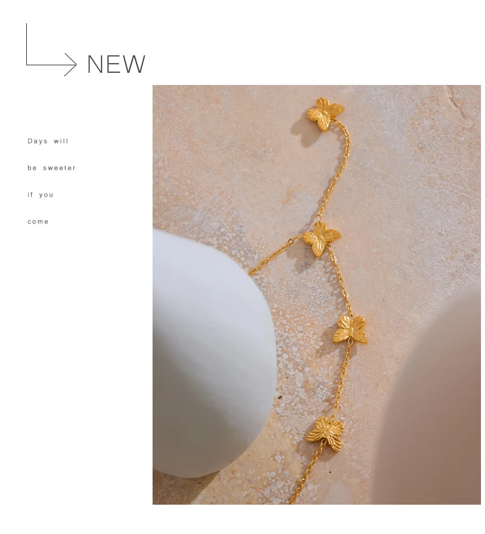 A whimsical necklace adorned with dainty butterflies scattered across a golden chain. Playful and light, it brings a touch of nature’s beauty to everyday style.