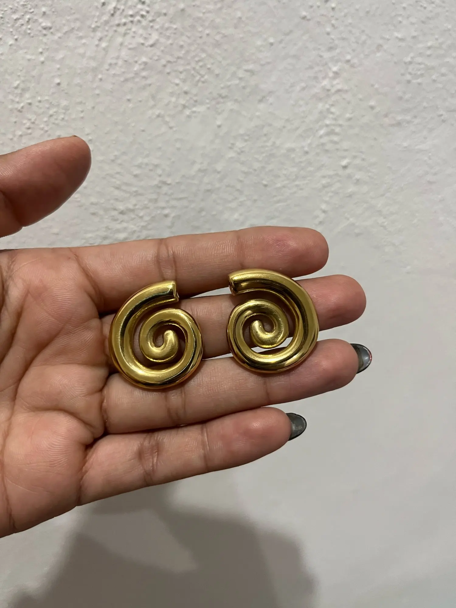 Sculptural spiral hoops with a polished golden finish, designed to stand out with artistic flair. These bold earrings embody confidence and individuality.