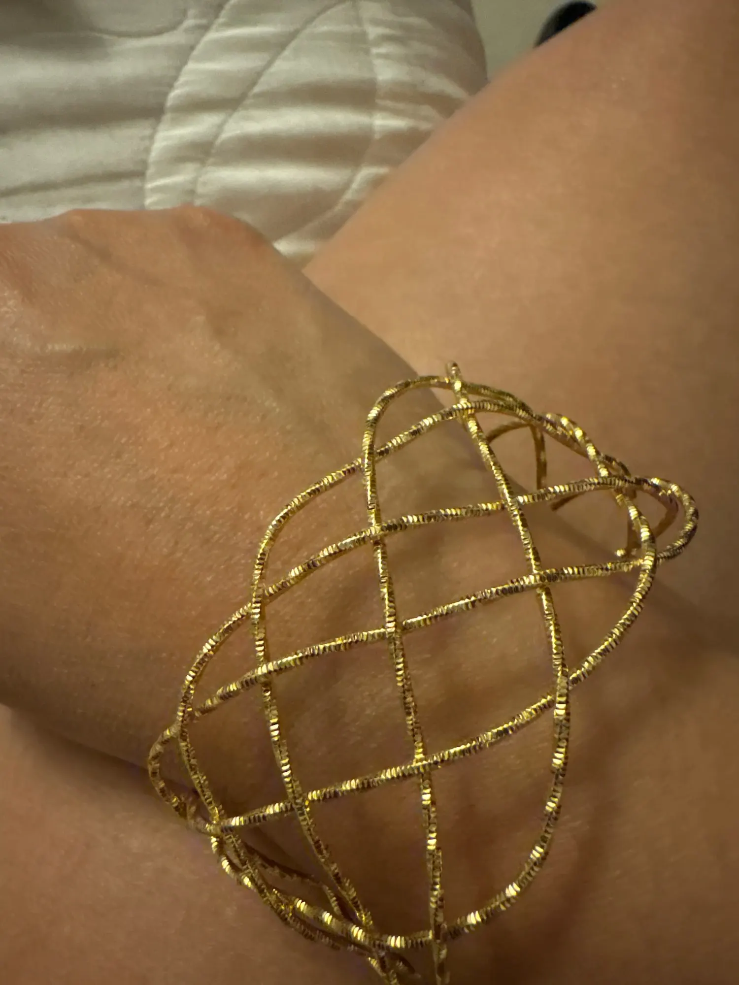 An artistic bracelet crafted with an intricate crisscross lattice design that radiates contemporary chic. Lightweight yet bold, it’s the perfect accessory to elevate both casual outfits and evening looks with a modern touch of luxury.