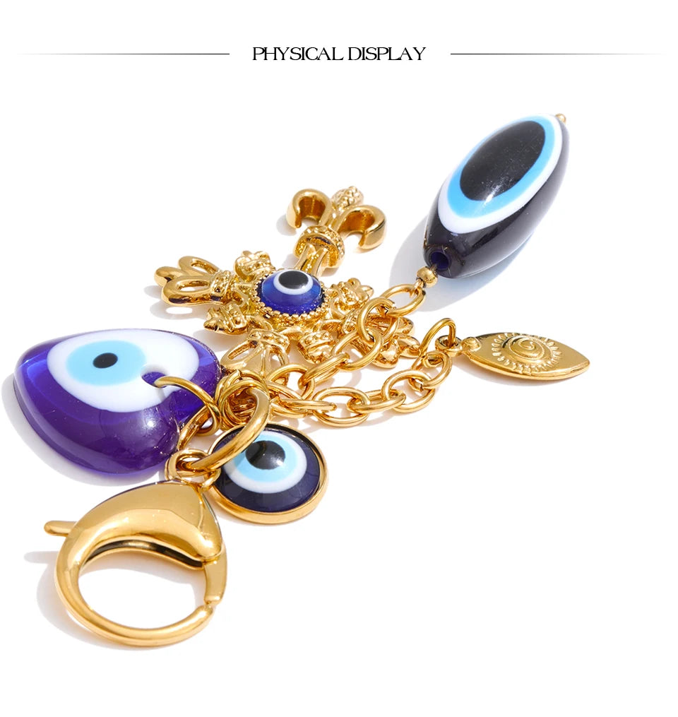 A protective-eye keychain featuring layered blue Nazar beads, a faceted drop charm, and gold-plated luxury chains. The mix of matte and glossy blues gives it a bold, statement finish.