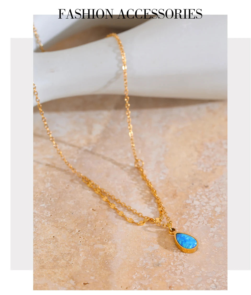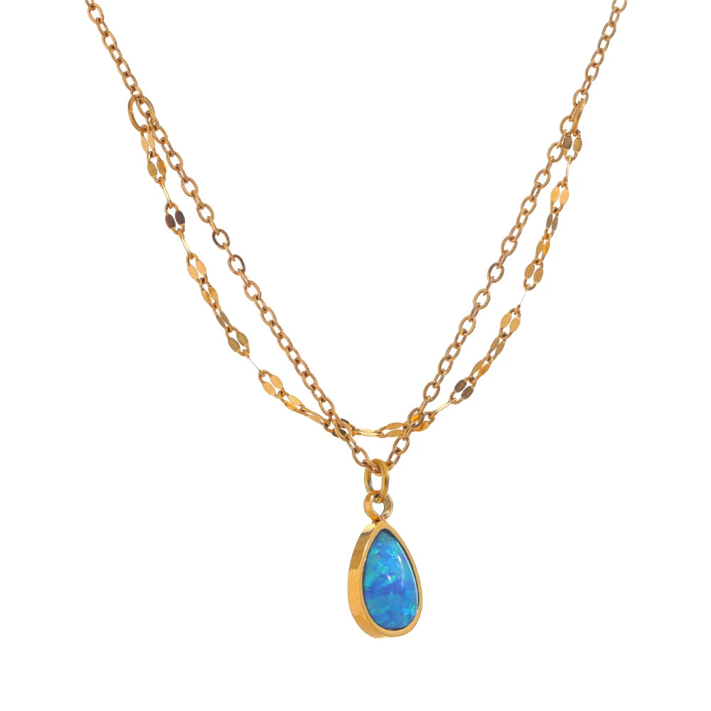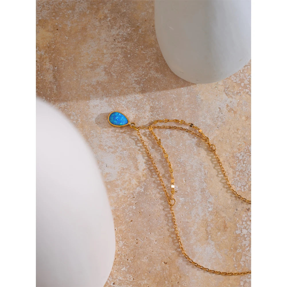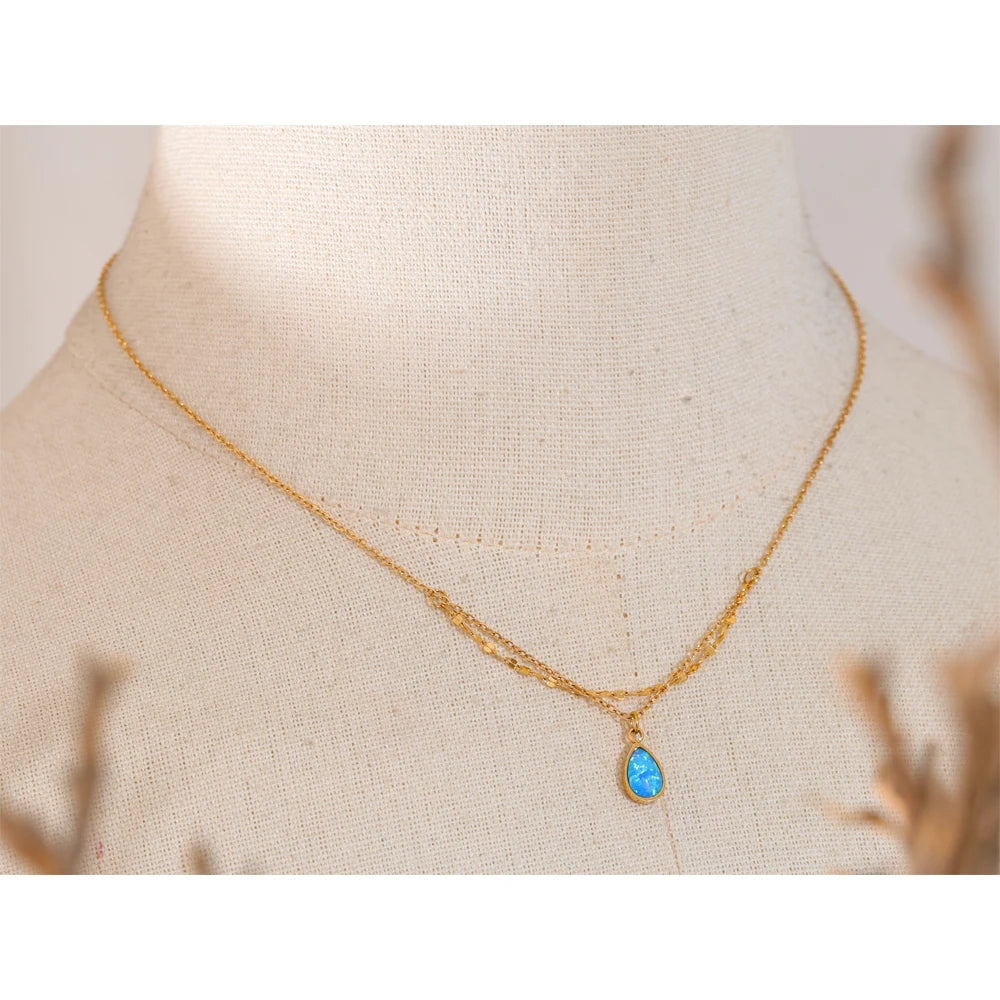 Featuring a vibrant blue teardrop pendant on a double chain, this necklace channels oceanic charm and bold sophistication for a statement look.