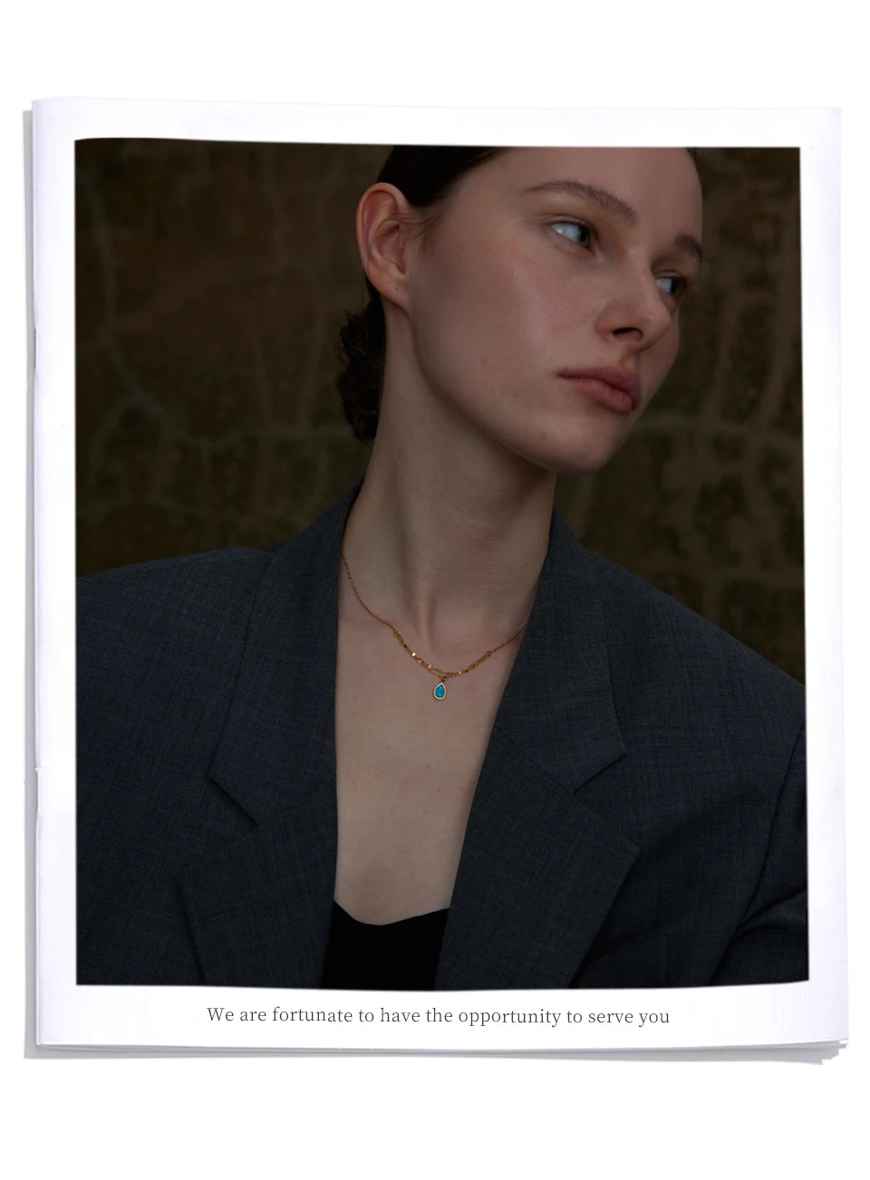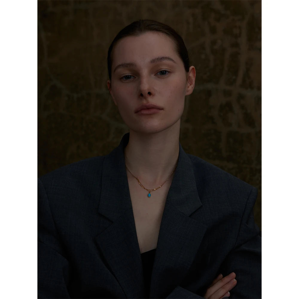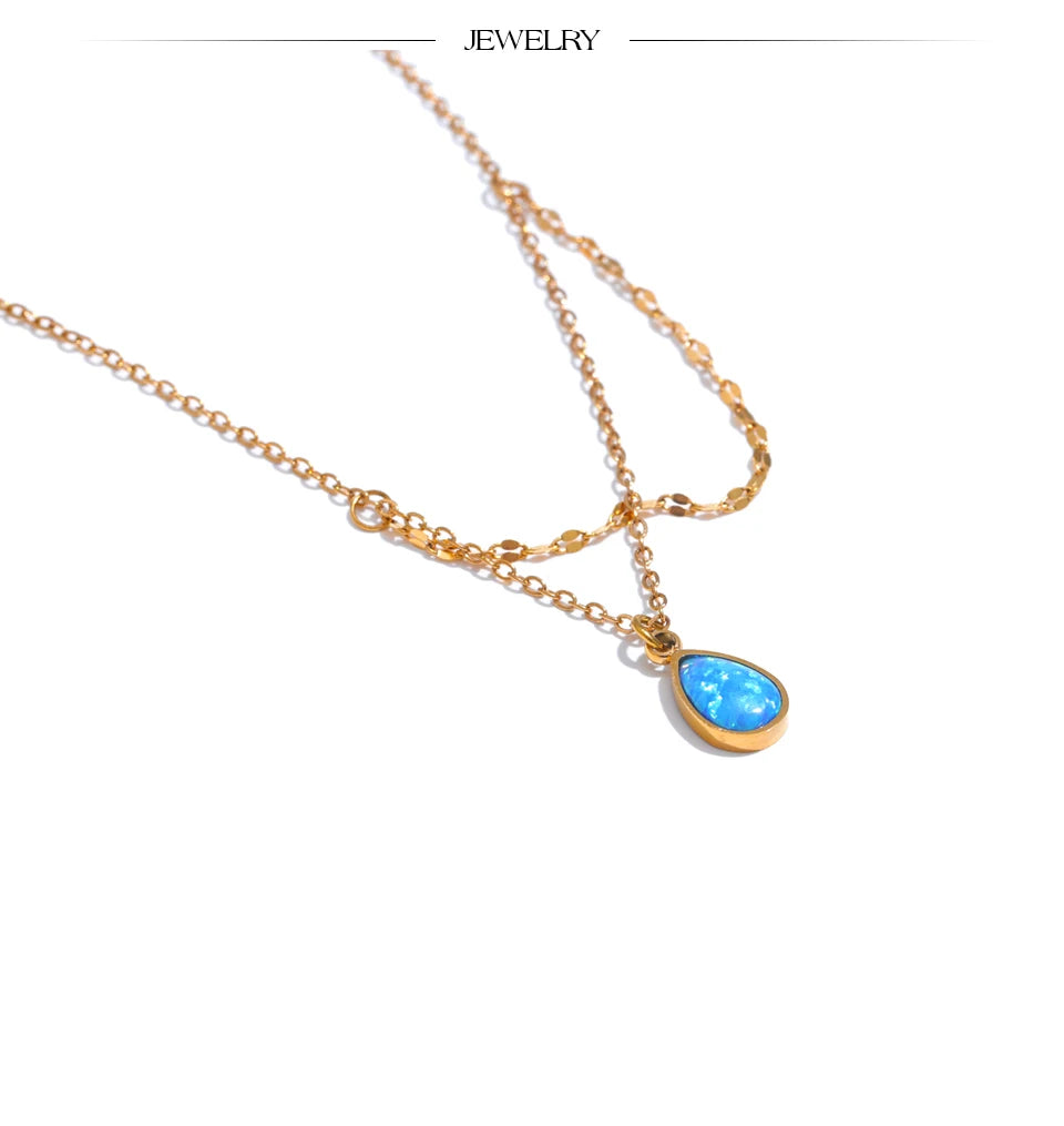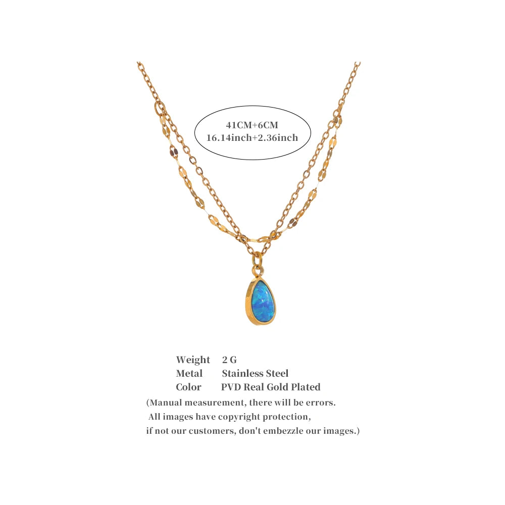 Featuring a vibrant blue teardrop pendant on a double chain, this necklace channels oceanic charm and bold sophistication for a statement look.